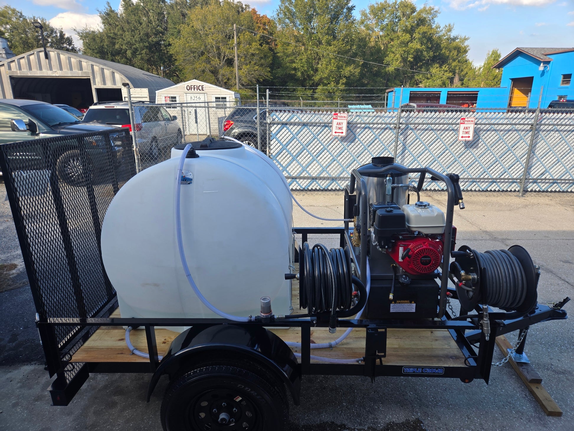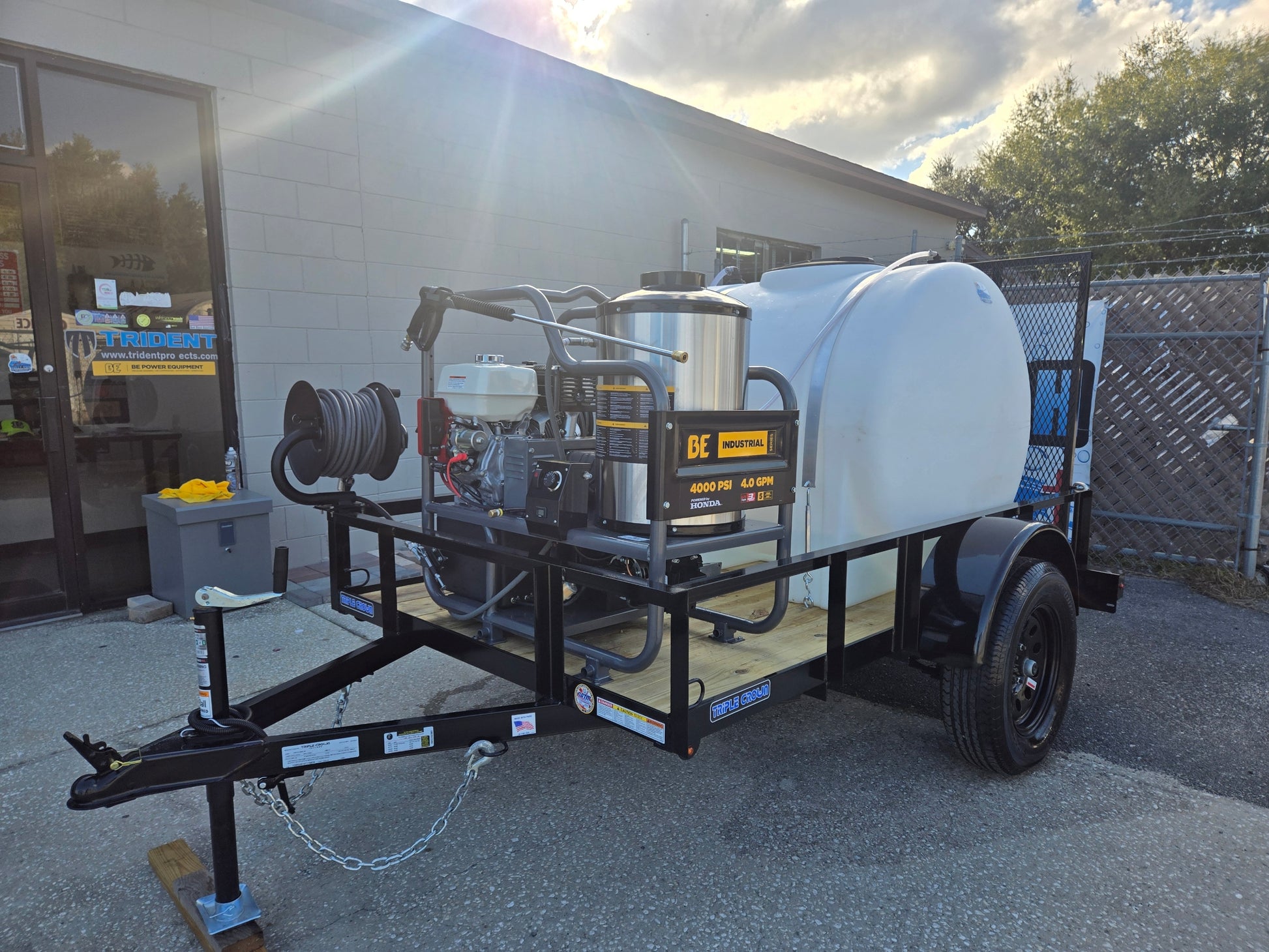 A general contractors best choice. This 4GPM 4000psi Honda hot water pressure washer has heat for tough stains and enough pressure to make the work quick. It is a belt driven machine meaning it pulls its own water from the 325 gallon tank.
